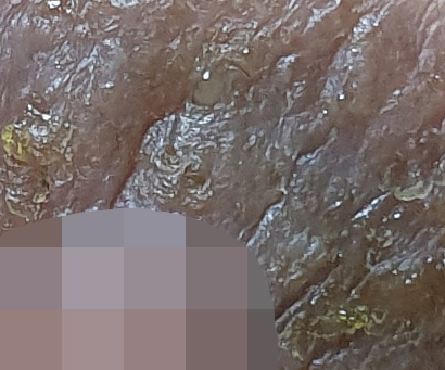 10월 즈음부터 가려움의 횟수가 점차 증가하더니, 11월 중순이 되었을 때 비로소 유두 '습진'의 심각성을 자각하게 된다. 샤워한 뒤 물기를 닦은 후 간지러움에 내 가슴을 바라보자, 유두(젖꼭지) 주변 유륜의 피부가 마치 각질(?!)처럼 벗겨져 있는 게 아닌가. 이때, 잘 알지도 못 하면서 그냥 그렇게 벗겨진 살을 계속해서 떼어버린 내가 바보였지... 그후로는 살이 쩍쩍 갈라지면서 진물 같은 게 나와 굳어서는 딱지를 형성하더라.