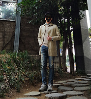 꽤나 '포멀 Formal'한 디자인의 '차이나 코트'에 '워싱 청바지'를 착용한